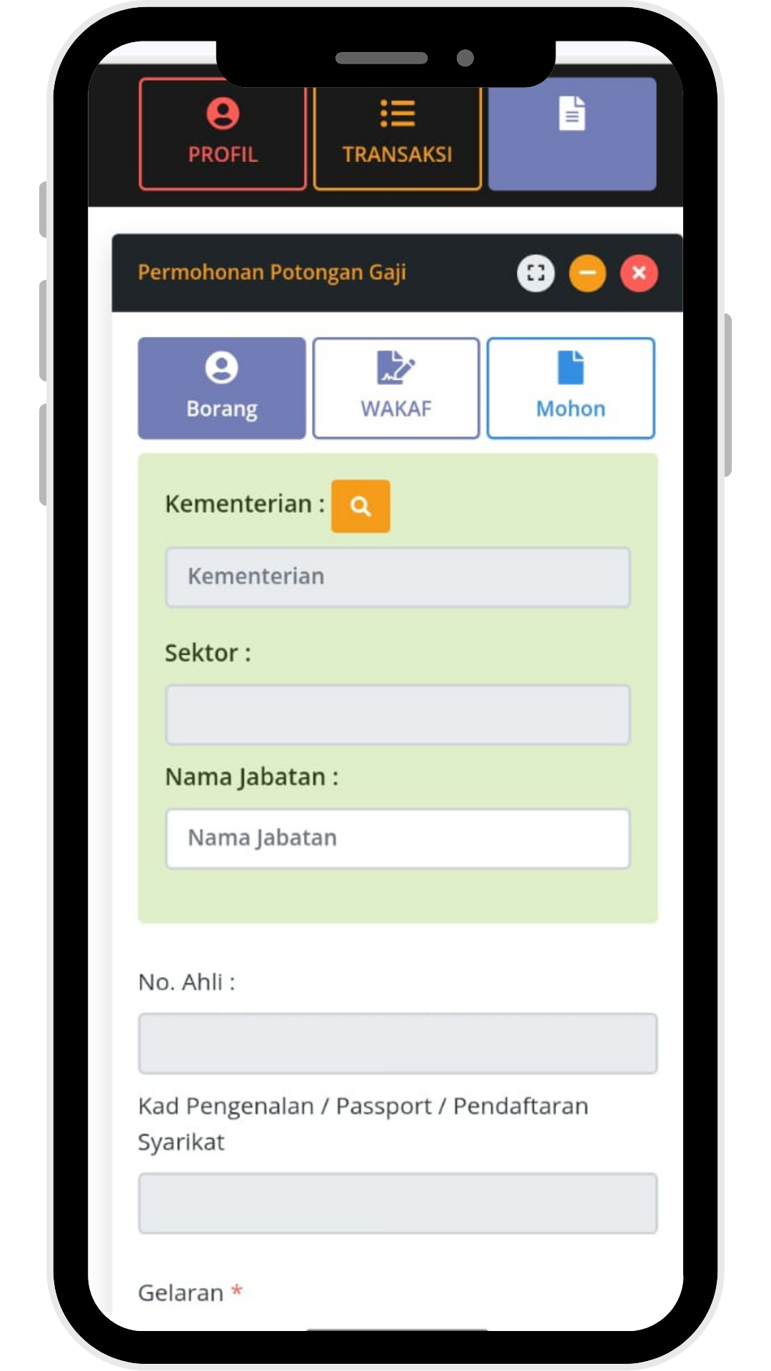 Pilih Potongan Gaji dan lengkapkan maklumat permohonan berwakaf melalui potongan gaji